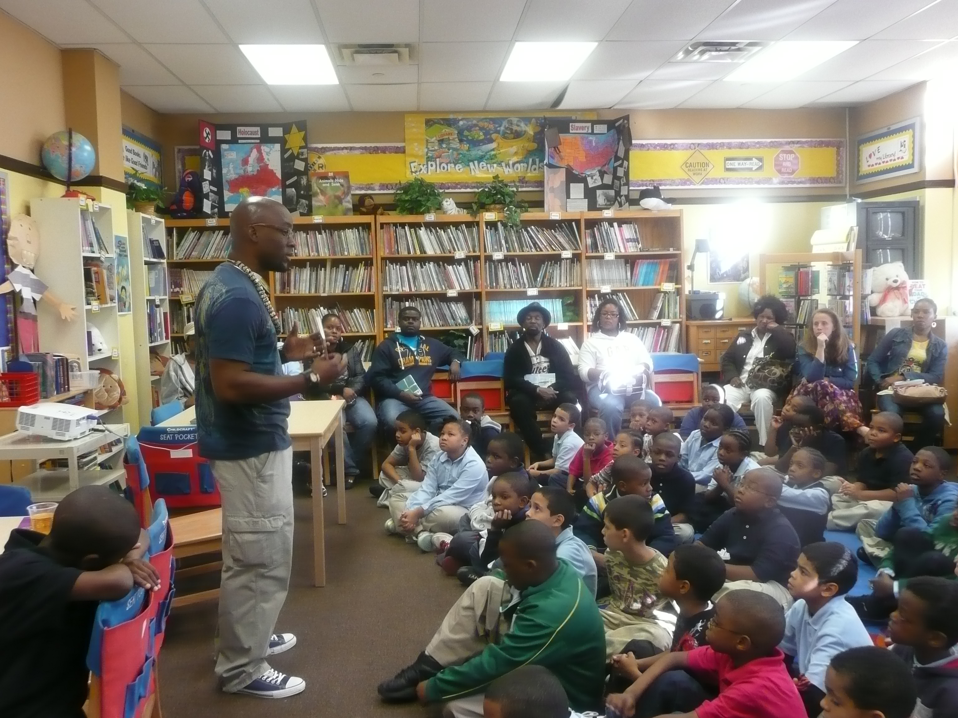 My 35-45 minute presentation (length depends on the age of the audience. Little folks, K-1, don’t want to sit that long, and I more than understand). The presentation consists of a brief introduction of my background; where I come from, how I became interested in reading and writing, my family life,etc.), a PowerPoint presentation that follows my path as a kid to becoming a published author. That is followed by a reading. The reading is centered around the interest of the hosting group or determined by age group/class level. That’s followed by a lively Q& A or brief discussion on the themes of the book section where students and teachers can ask about the writing process, editing, particular characters, personal questions,etc. Nothing is off limits…well…almost nothing. The Q &A is my favorite part of the presentation. We’ll finish up with a book signing for students who have ordered books and of course pictures. I love taking pictures with students, librarians, teachers, lunch ladies, whoever.